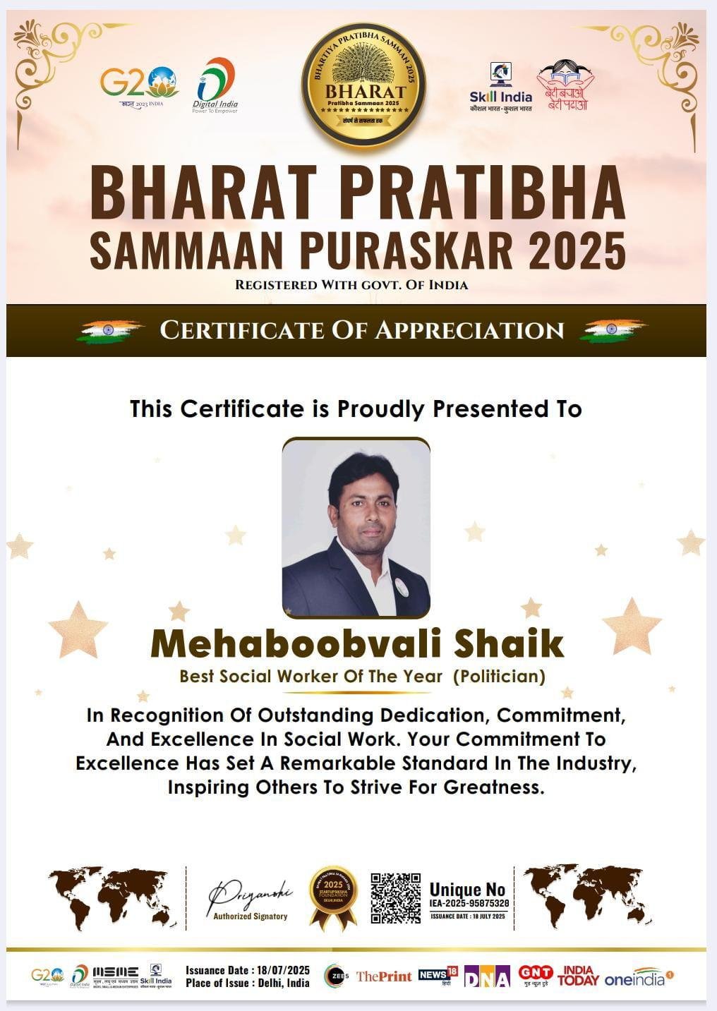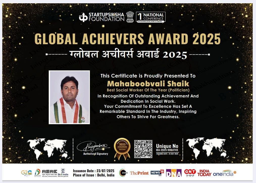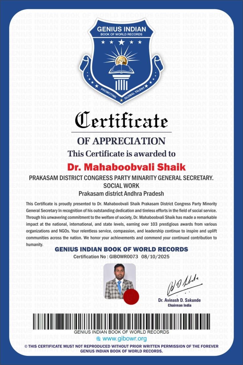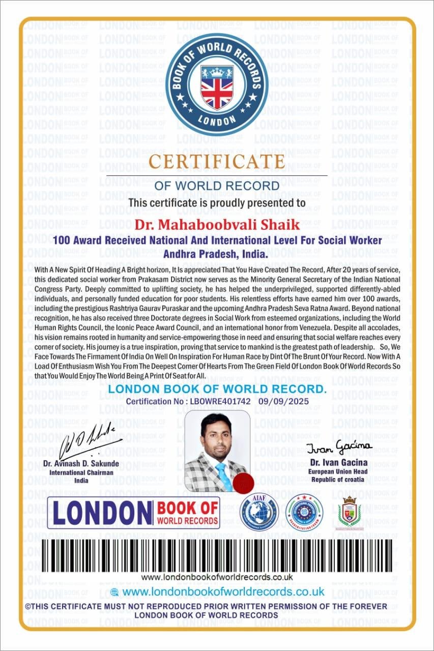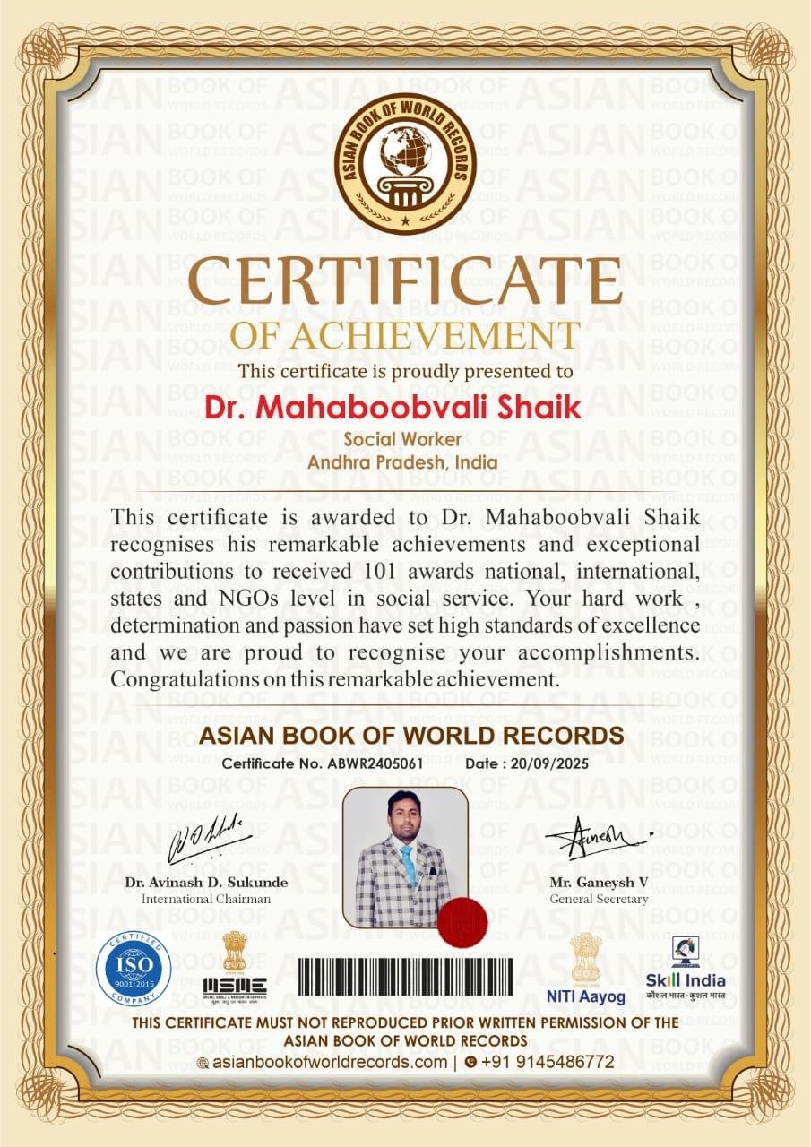 Dr. Mahaboob Vali Shaik is a visionary educationist and humanitarian, dedicated to empowering the youth through innovation, leadership, and compassion. His journey from a humble background to becoming a global educator is an inspiration to millions. With a legacy of 100+ awards, he continues to redefine excellence in social reform and education.