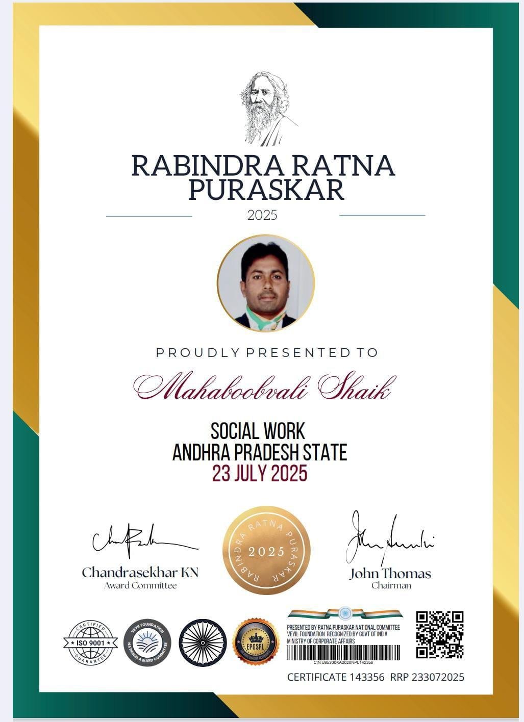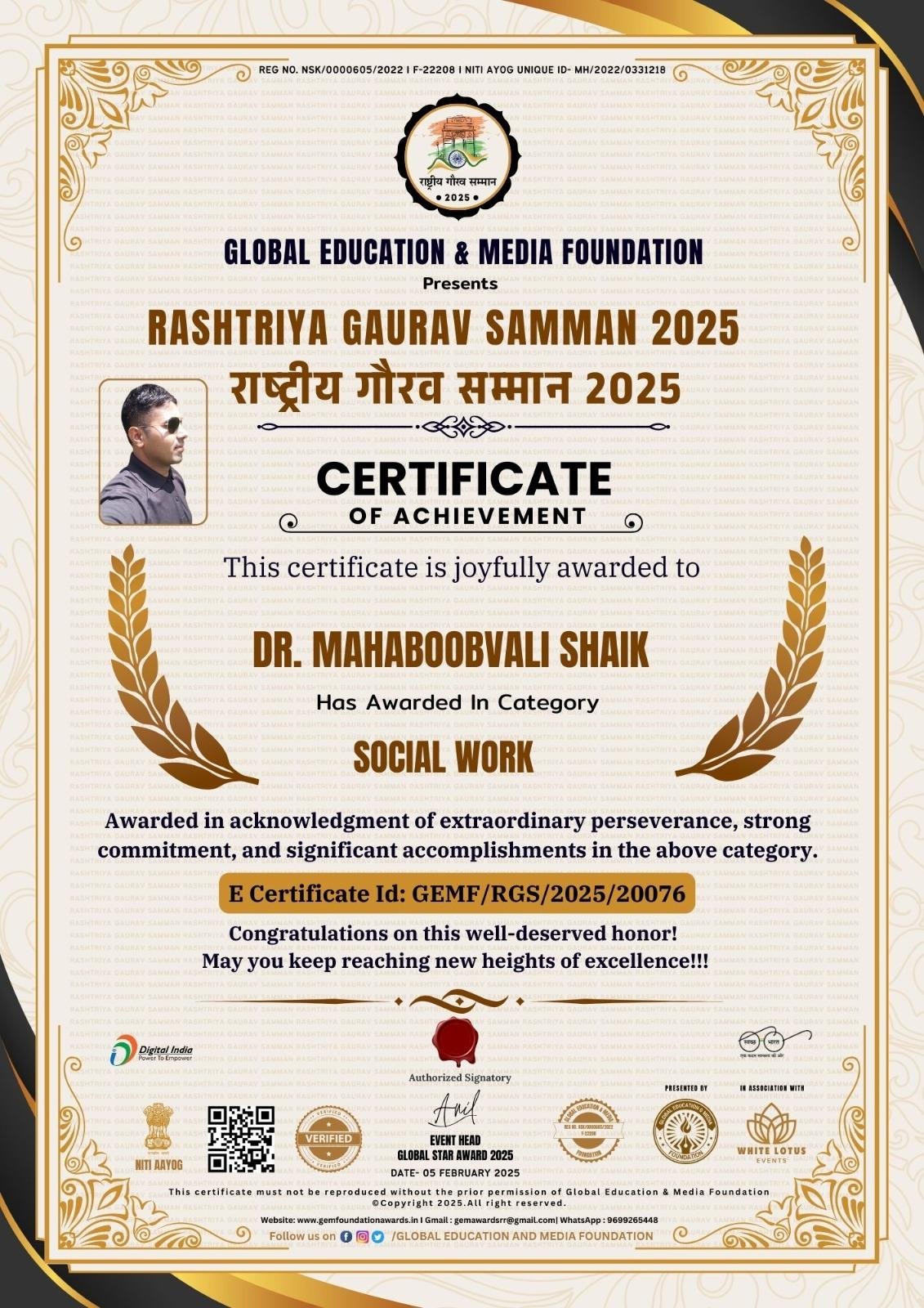 The gallery of Dr. Mahaboob Vali Shaik, a distinguished social worker and national award recipient, showcases his lifelong dedication to humanity.