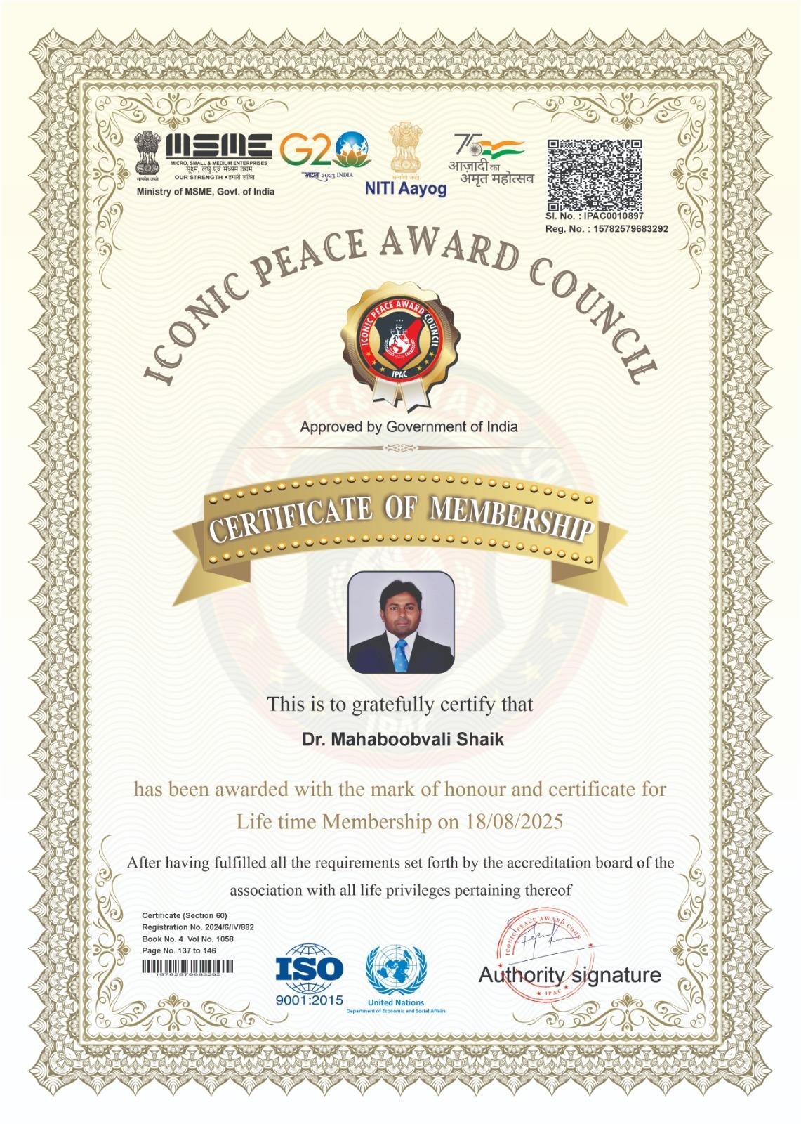 Explore the prestigious honors and global recognitions earned by Dr. Mahaboobvali Shaik.