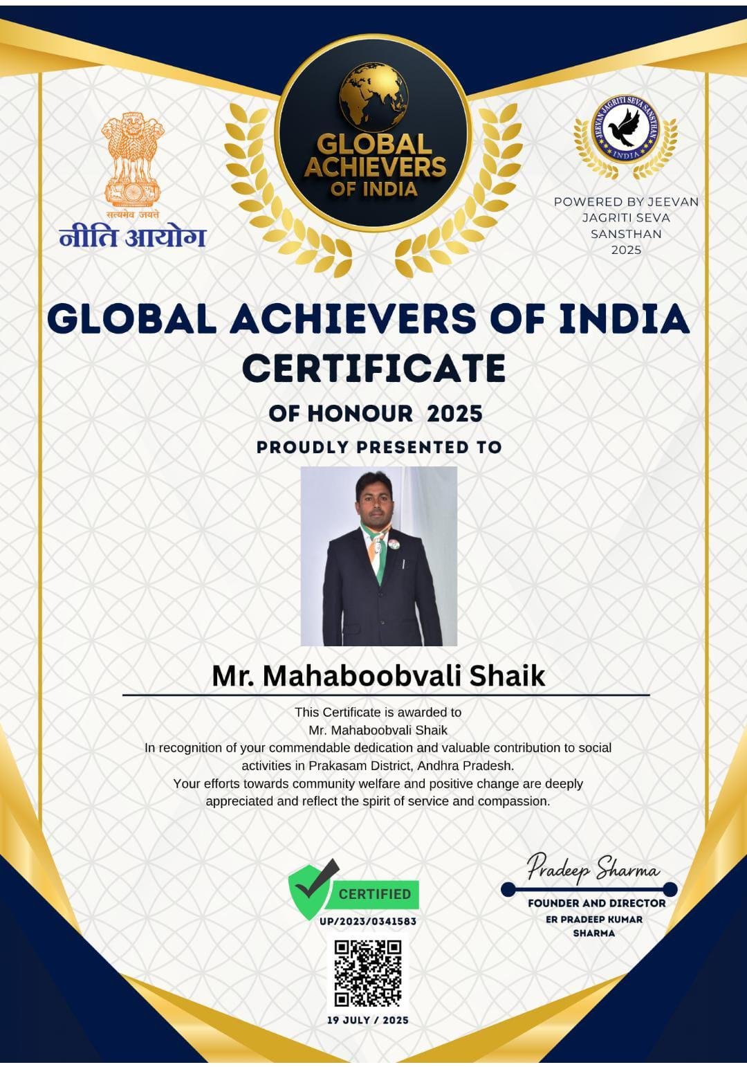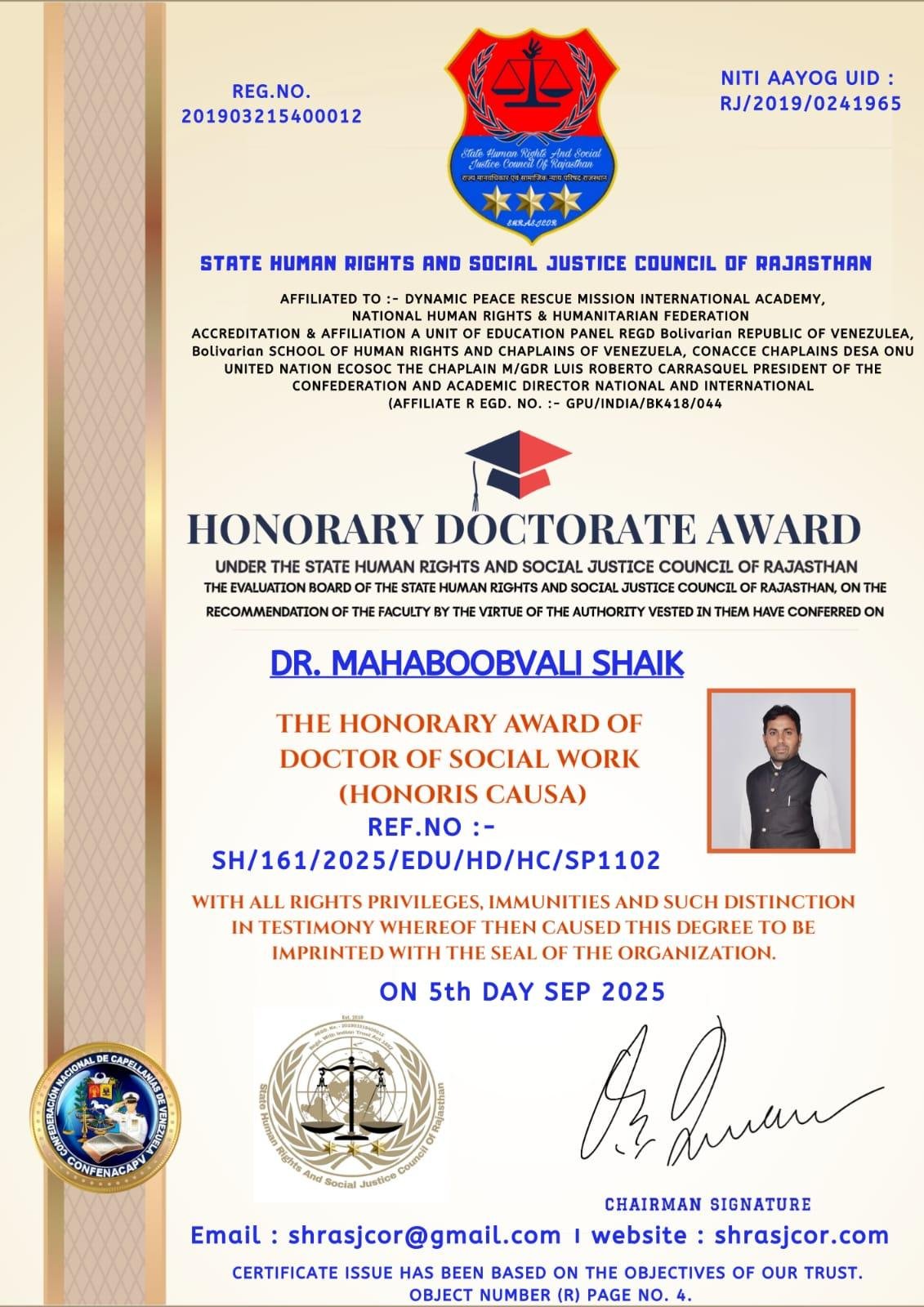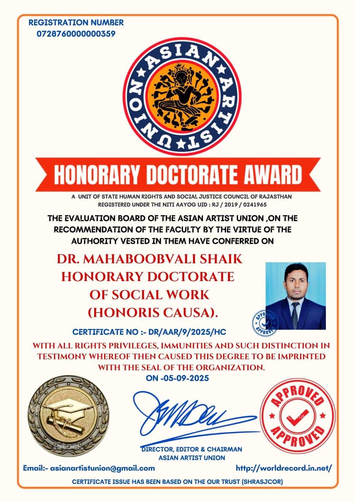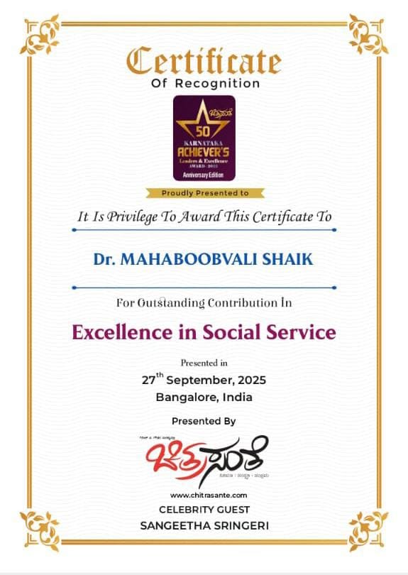 “My mission is to educate, empower, and elevate humanity through compassion and knowledge. Every child deserves a chance to shine — and I dedicate my life to ensuring education reaches every heart that dreams.” — Dr. Mahaboob Vali Shaik