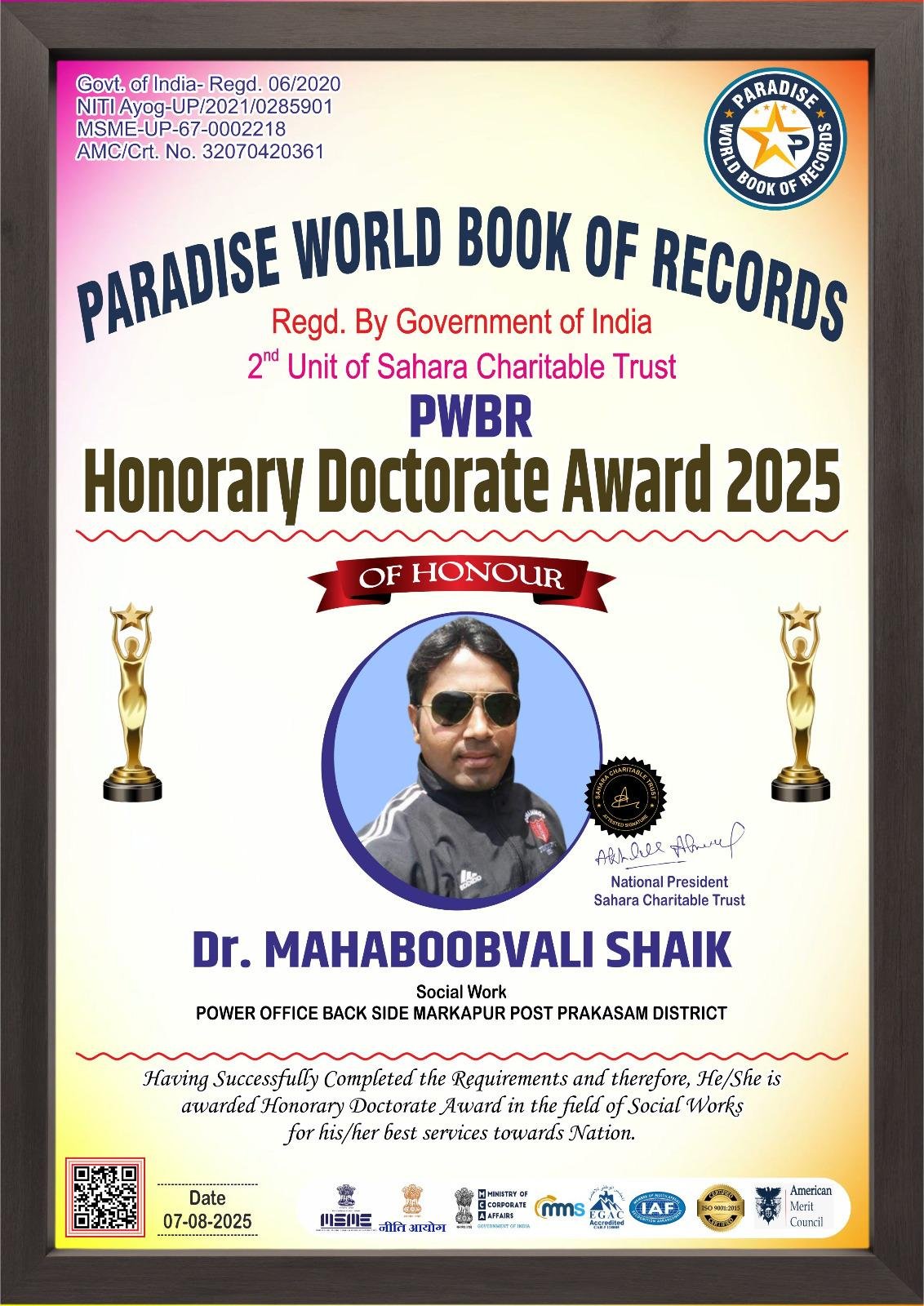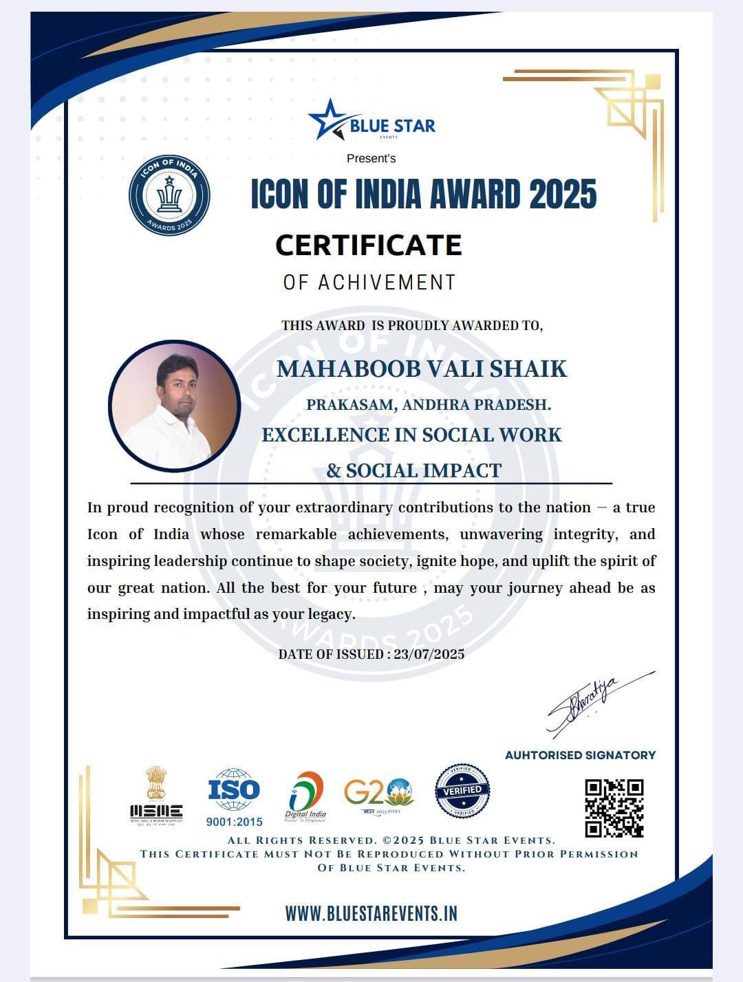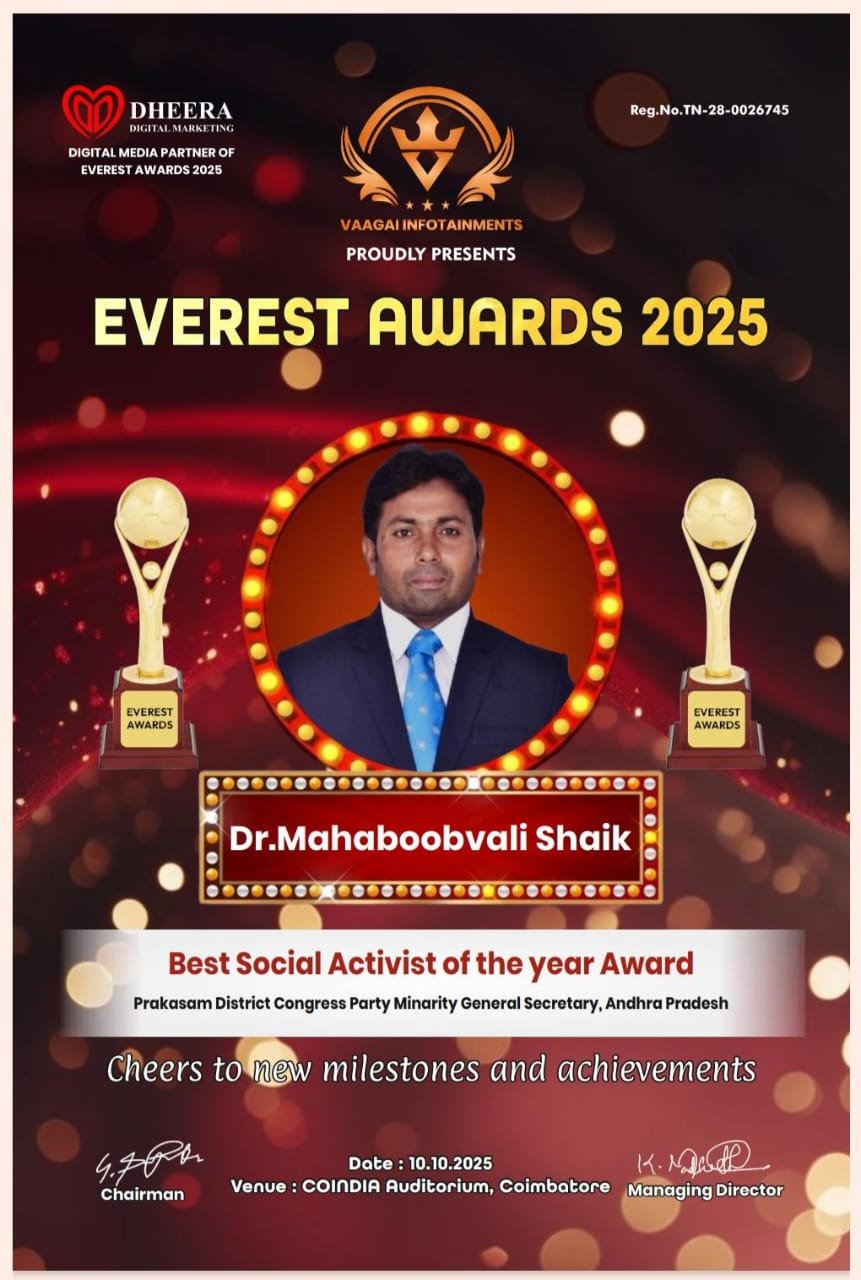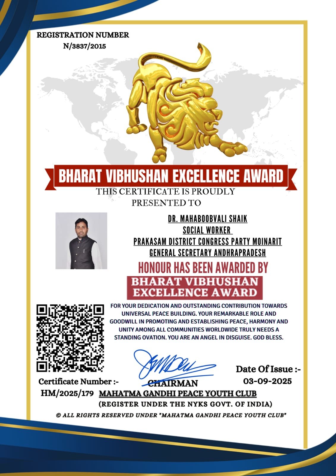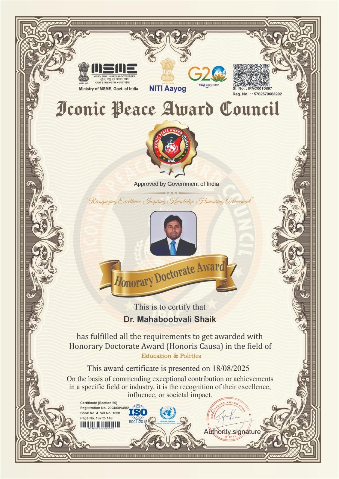 Dr. Mahaboob Vali Shaik is a visionary educationist and humanitarian, dedicated to empowering the youth through innovation, leadership, and compassion. His journey from a humble background to becoming a global educator is an inspiration to millions. With a legacy of 100+ awards, he continues to redefine excellence in social reform and education.
