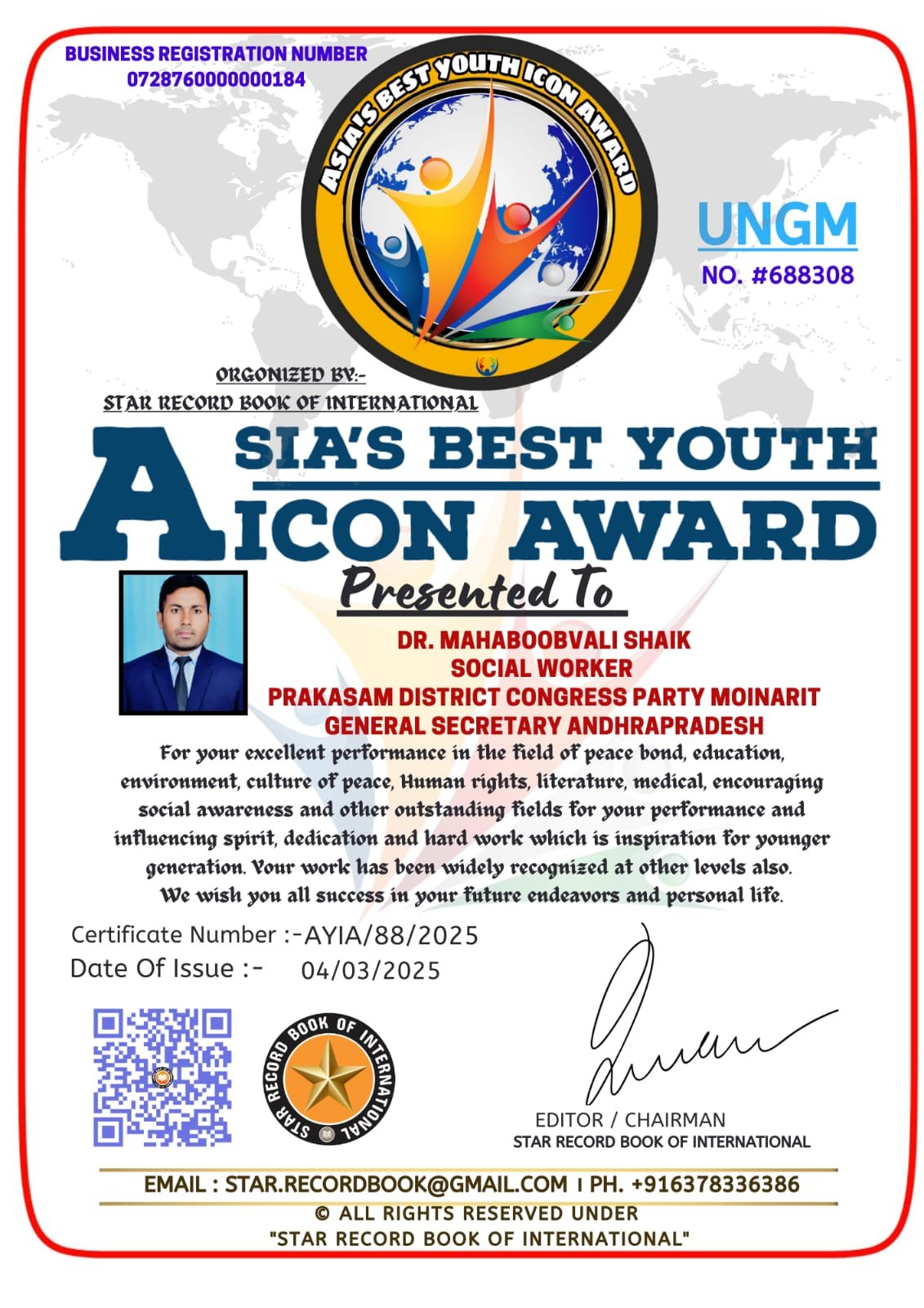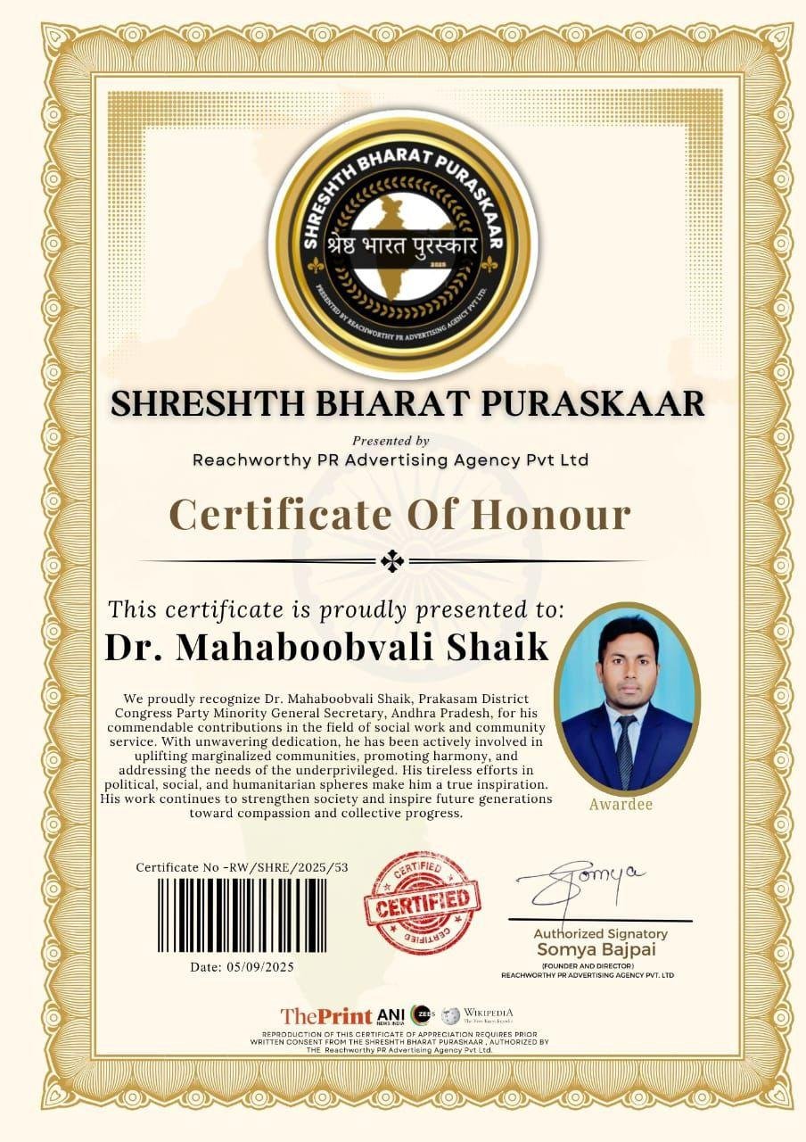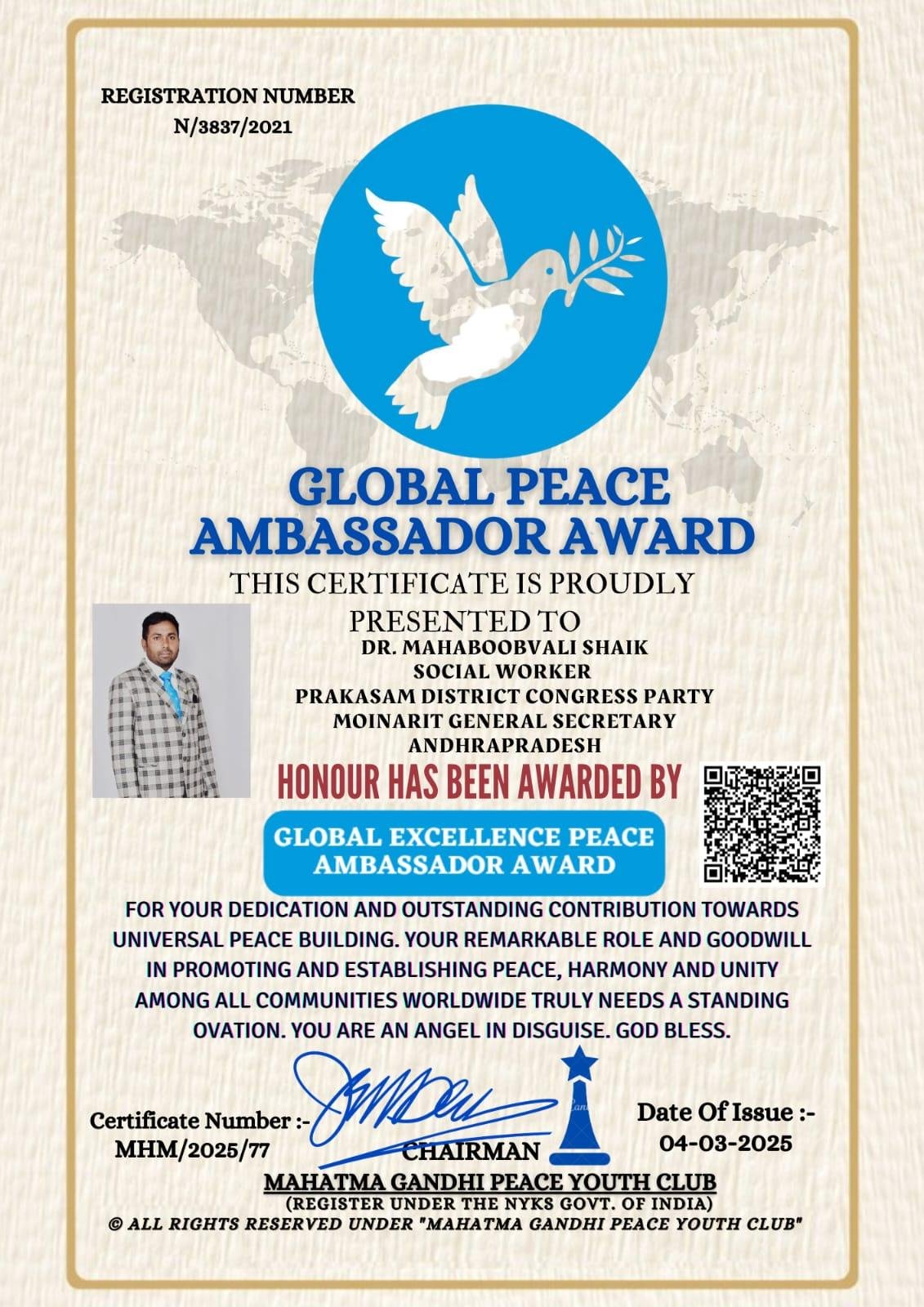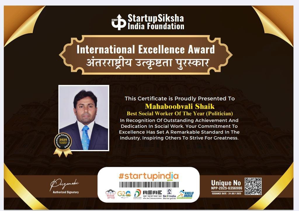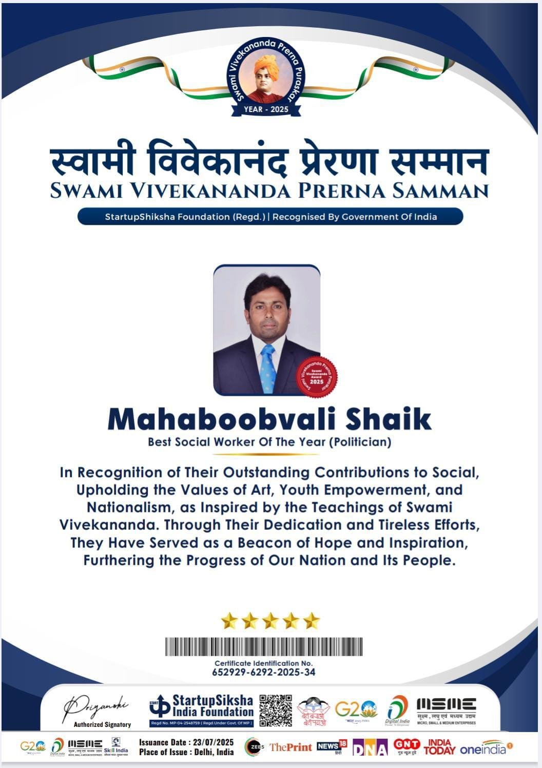Dr. Mahaboob Vali Shaik is a visionary educationist and humanitarian, dedicated to empowering the youth through innovation, leadership, and compassion. His journey from a humble background to becoming a global educator is an inspiration to millions. With a legacy of 100+ awards, he continues to redefine excellence in social reform and education.
